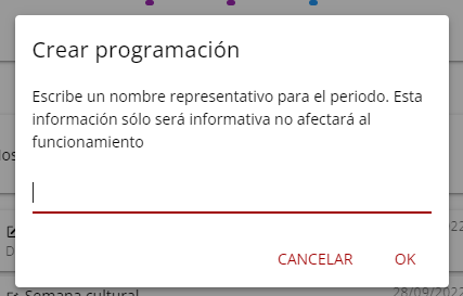 Lo primero que se debe introducir es el nombre. Este nombre sirve únicamente como etiqueta pero no afecta al funcionamiento de la aplicación ni los periodos. Una vez escrito el nombre se creará la programación y se navegará automáticamente a la ventana de edición.