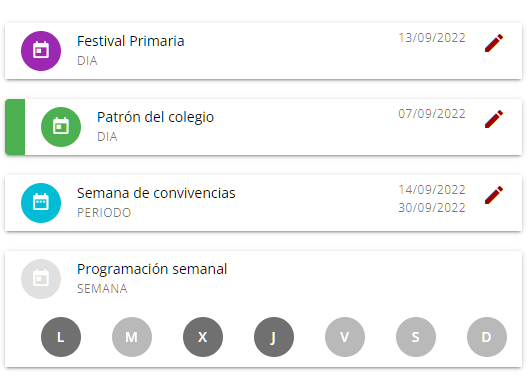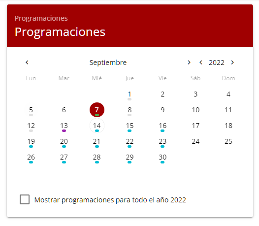 Aparece un calendario en pantalla en el que se puede ver qué días tienen una programación específica marcado con un subrayado de color. Por defecto aparece el mes actual y se preselecciona el día de hoy, pero, puede navegarse desde el propio calendario entre diferentes meses y años.