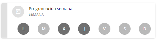 Además de las programaciones definidas siempre aparece una programación semanal. Esta programación no tiene fecha de inicio ni fin y permite definir dietas para “Todos los Lunes”, “Todos los Viernes”, etc. Los días para los que se ha definido una programación aparecen marcados en color oscuro, los que no en color claro.