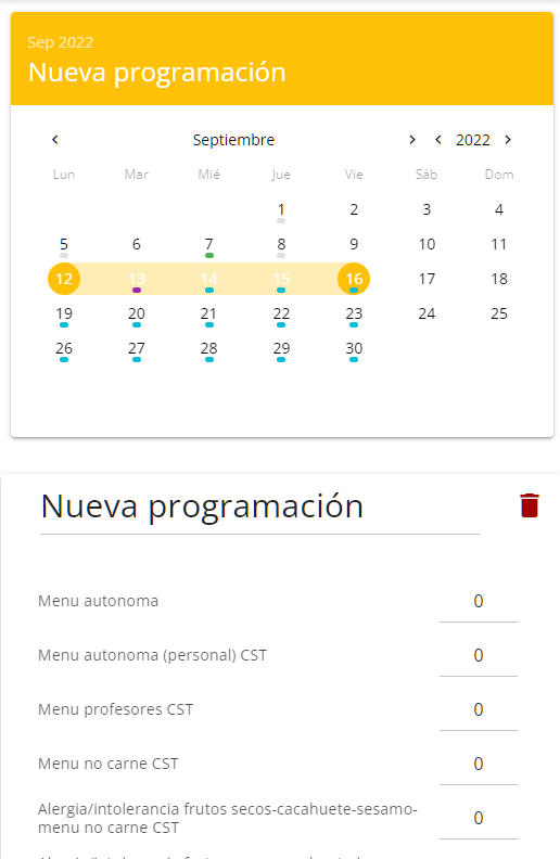 Si hacemos click sobre un día del calendario se marcará en la lista de programaciones aquella que corresponda. Si no hay ninguna programación activa en la fecha pero si hay una programación semanal para el día de la semana seleccionado, se marcará en la lista la programación semanal. En ella aparecen marcados en oscuro los días para los que se ha programado u pedido y en gris claro los que no tienen datos al respecto.