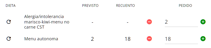 Columna DIETA: Nombre de la dieta y un botón de “actualizar” que cambia automáticamente el valor del pedido al valor original.